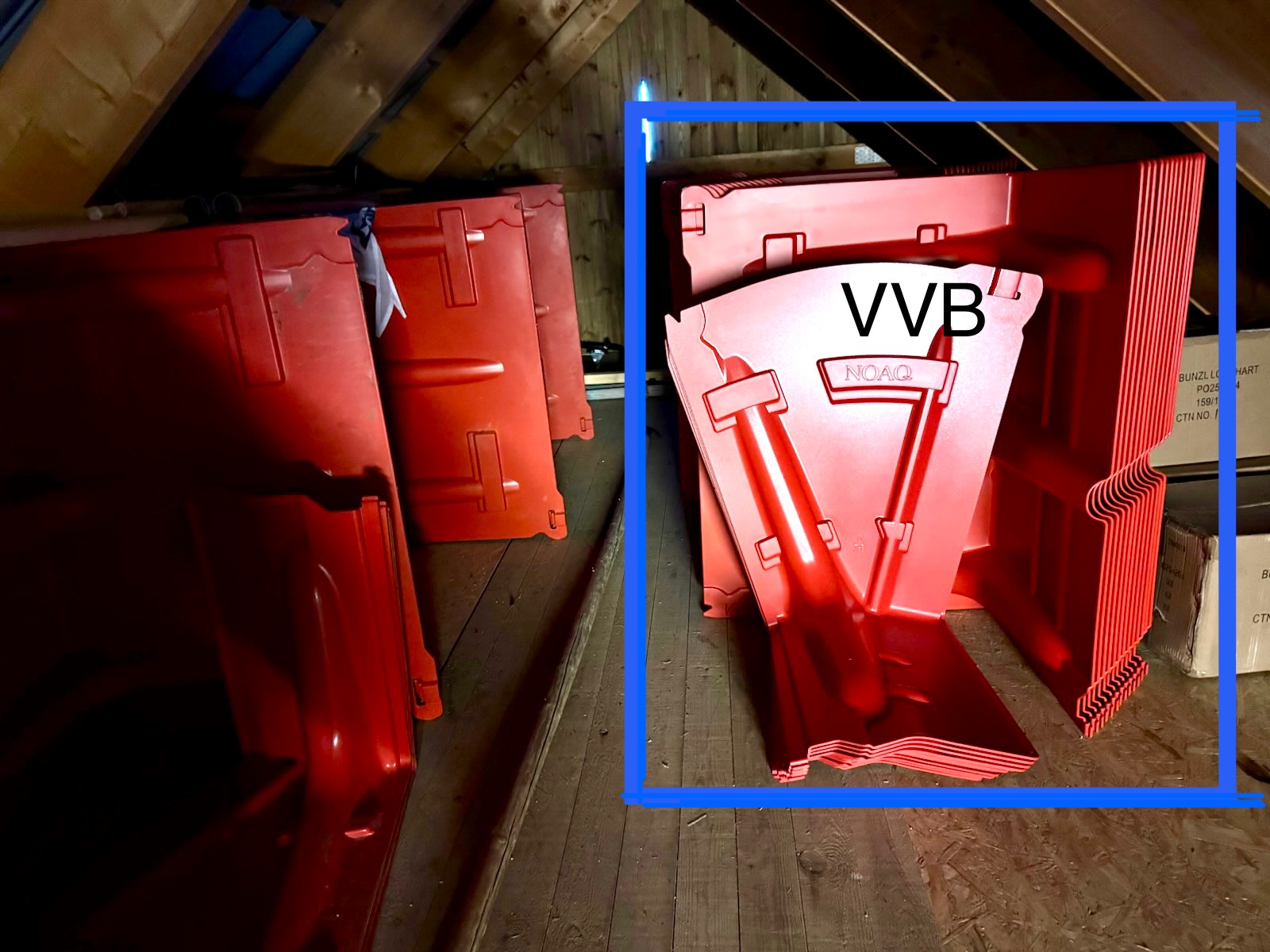 5. Find stormflodssikring på sejlklubbens loft (havnefoged har nøgle). De står til højre på loftet i tre "bunker" og er markeret med VVB med sort tusch og et manila-mærke på hver "bunke" [Billede #1 ⬇️]