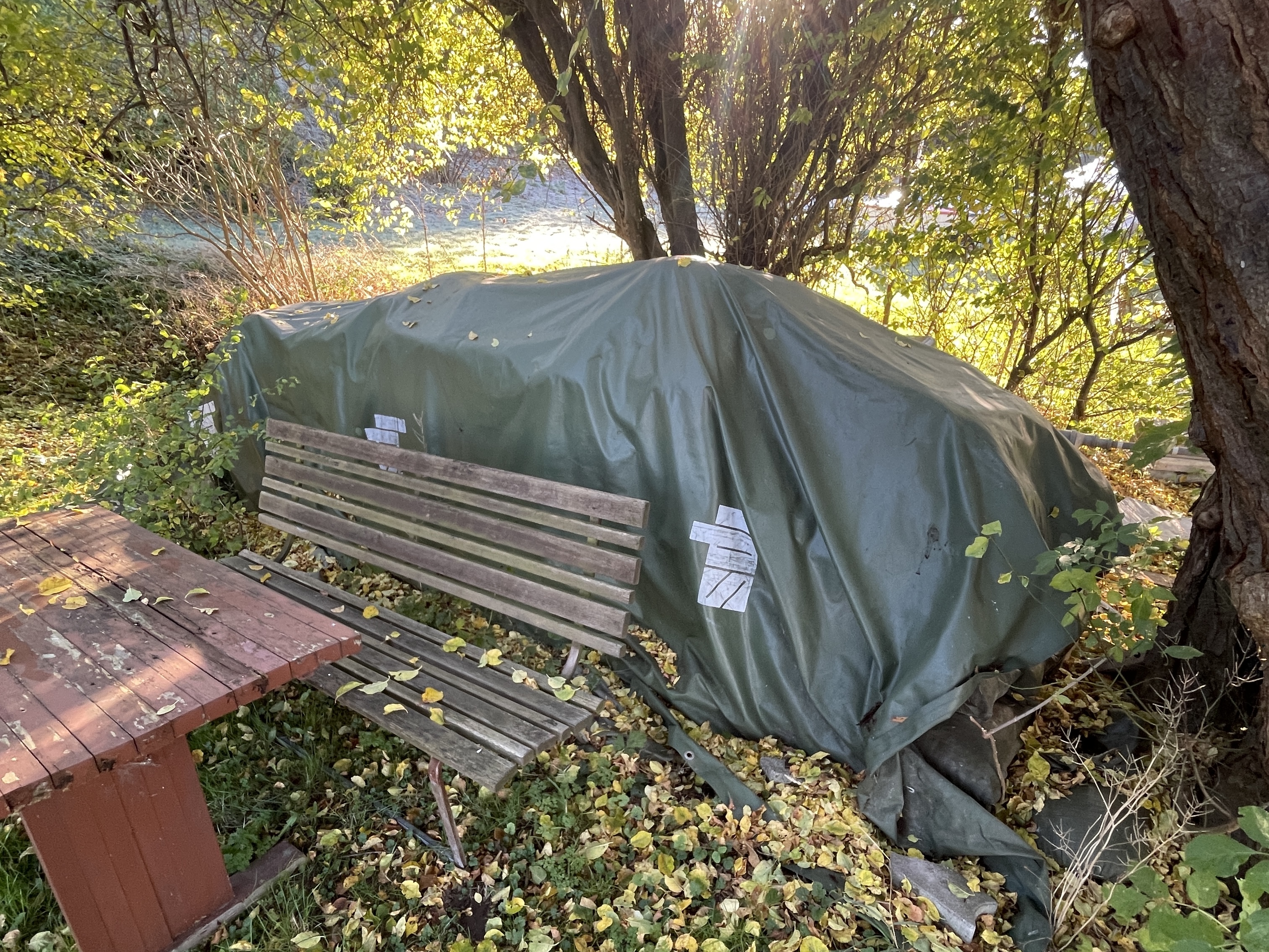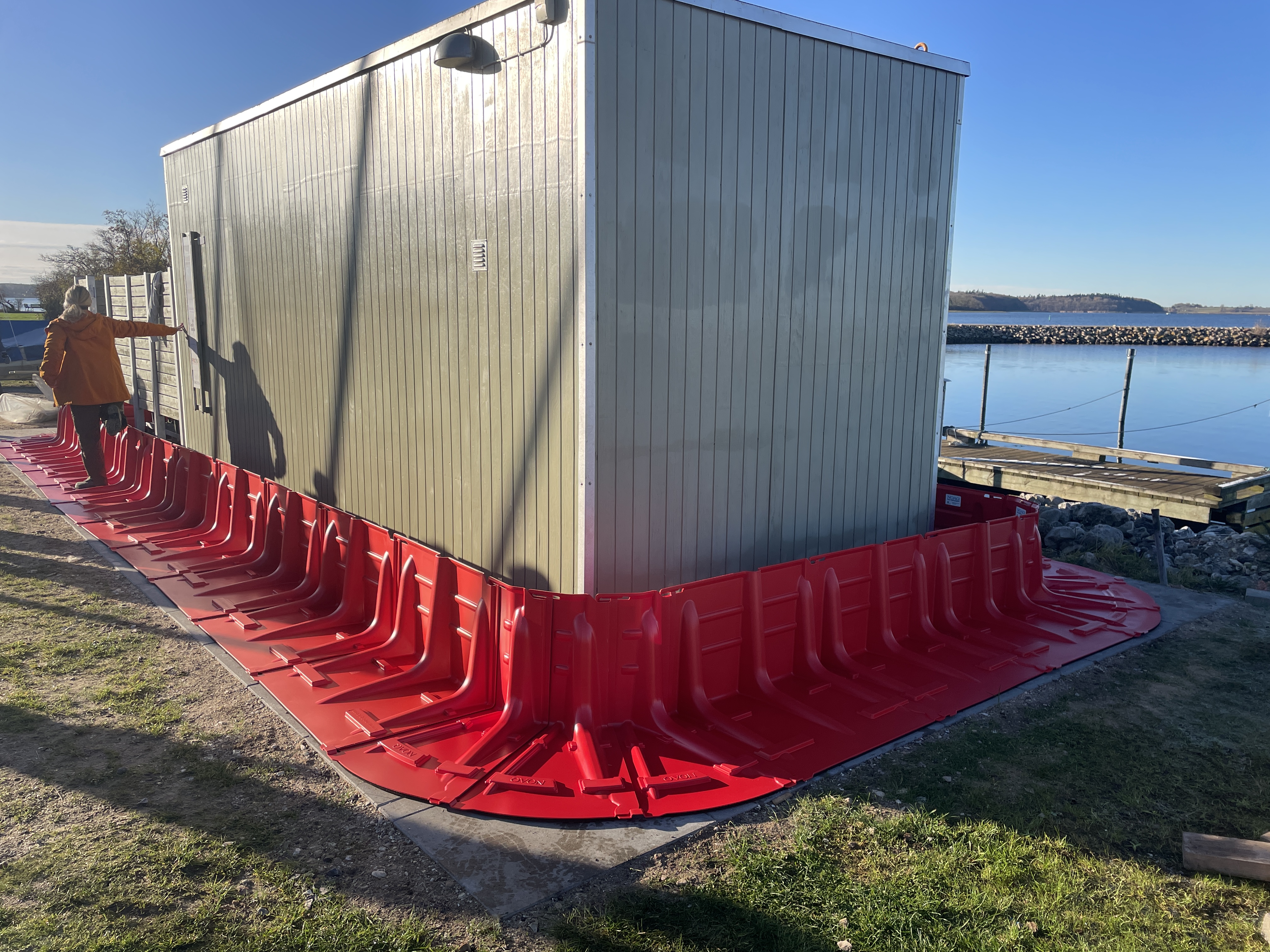 12. Der lægges sandsække over foden på elementerne foran sauna på vandsiden og mod nord (mod VSB klubhus). Cirka 15 sandsække i alt. Fyldte sandsække ligger under pressenning på græs til venstre for at bilrampen der fører ned til havnen [Billede #4 ⬇️]